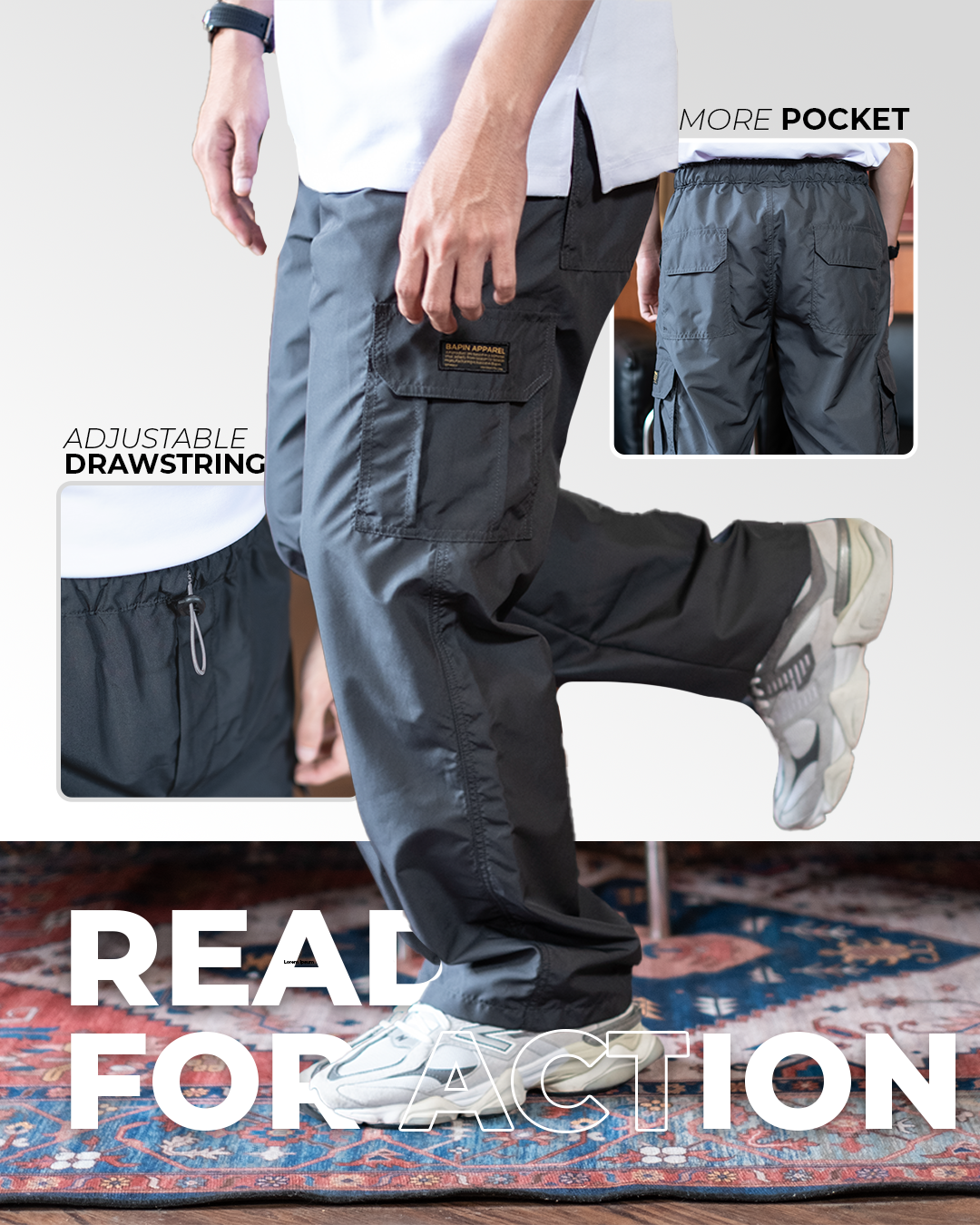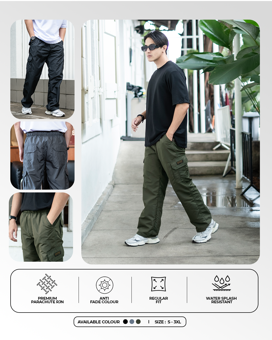 Menggunakan material Parachute Premium yang ringan, lembut, dan warna tahan lama, celana ini dirancang untuk mendukung setiap aktivitas kamu.